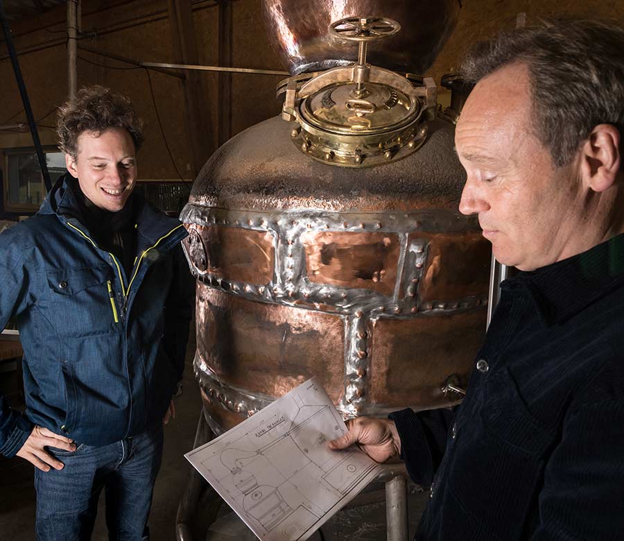 On avait en effet ce vieil alambic qui ne fonctionnait plus. Au départ je pensais que c’était un alambic Shears and Sons, qui était un chaudronnier de génie du début du 19e. Mais il produisait des machines hyper complexes avec des lentilles de rectification et ça ne collait pas avec notre modèle.